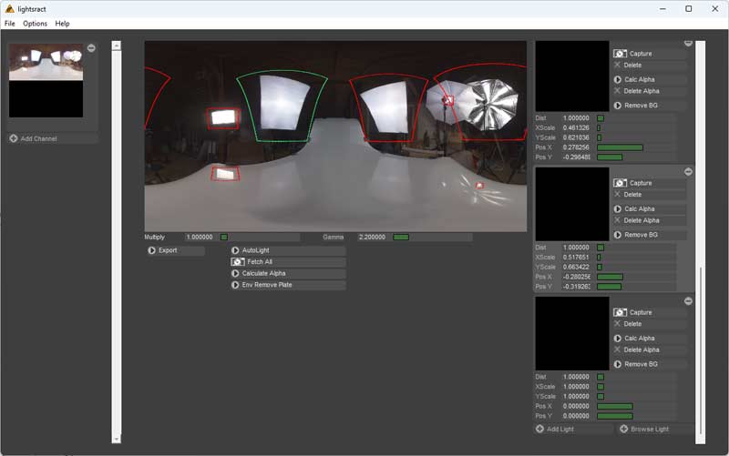 Auto Lights Will generate the Lights and position them automatically. Currently does not work with low dynamic images. Fetch All Captures all Plate images from the environment image It ill display them as linear in OpenGLview on purpose to provide a visual clue wich images are extracted Calculate Alpha Tries to get the alpha from the luminance for
